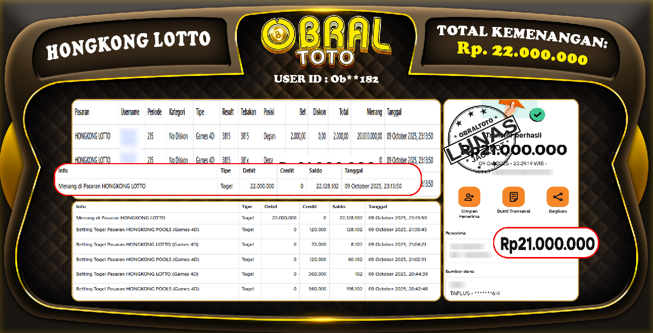 Kami merayakan selamat kepada salah satu pemain setia situs OBRALTOTO yang berhasil meraih kemenangan besar senilai Rp,22.000.000dalam permainan HONGKONG LOTTO pada tanggal 09 October 2025. Kemenangan ini telah kami proses dan pemahaman secara LUNAS ke rekening yang terdaftar. Semoga kemenangan ini menjadi motivasi bagi pemain lainnya untuk terus mencoba keberuntungan dan menikmati permainan di OBRALTOTO .