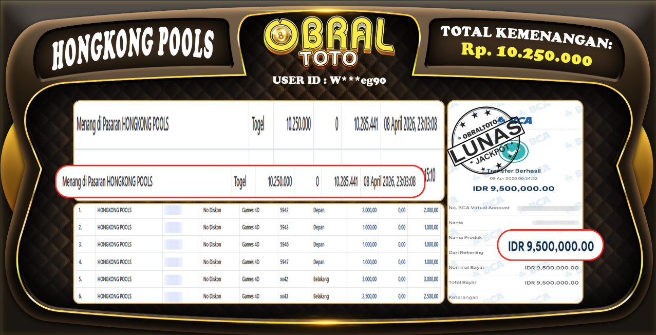 Kami merayakan selamat kepada salah satu pemain setia situs OBRALTOTO yang berhasil meraih kemenangan besar senilai Rp 10.250.000 dalam permainan HONGKONG POOLS pada tanggal 10 APRIL 2026 . Kemenangan ini telah kami proses dan pemahaman secara LUNAS ke rekening yang terdaftar. Semoga kemenangan ini menjadi motivasi bagi pemain lainnya untuk terus mencoba keberuntungan dan menikmati permainan di OBRALTOTO .