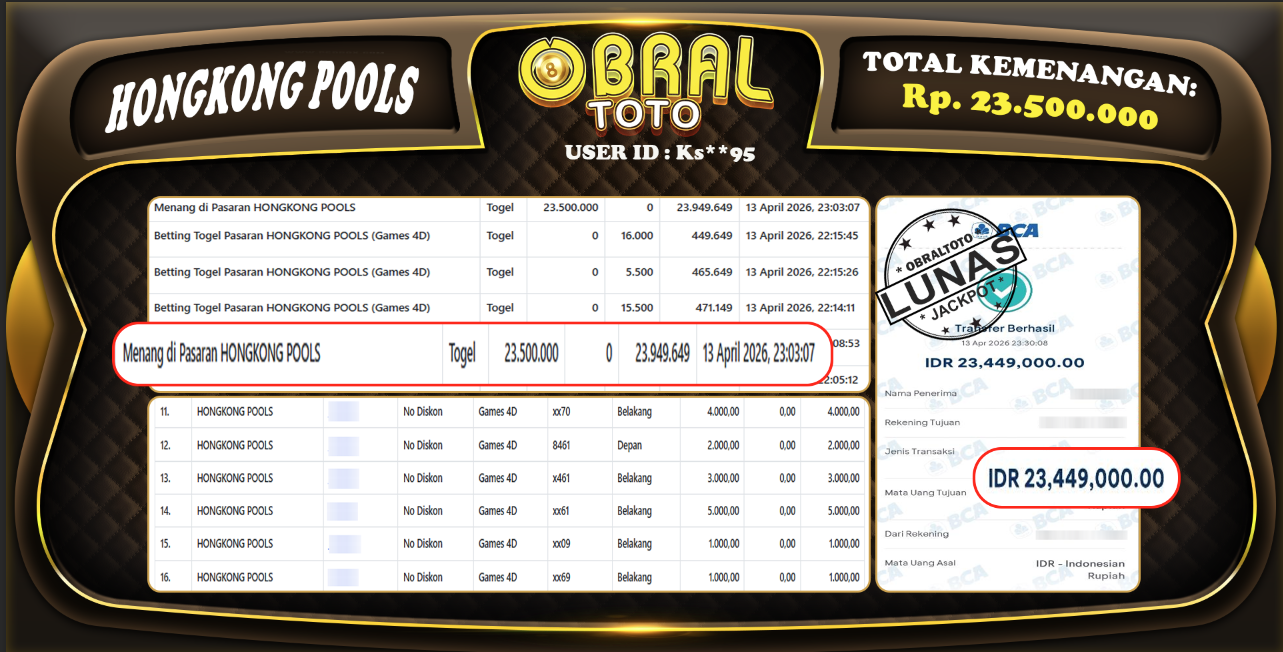 Kami merayakan selamat kepada salah satu pemain setia situs OBRALTOTO yang berhasil meraih kemenangan besar senilai Rp 23.500.000 dalam permainan HONGKONG POOLS pada tanggal 14 APRIL 2026 . Kemenangan ini telah kami proses dan pemahaman secara LUNAS ke rekening yang terdaftar. Semoga kemenangan ini menjadi motivasi bagi pemain lainnya untuk terus mencoba keberuntungan dan menikmati permainan di OBRALTOTO .