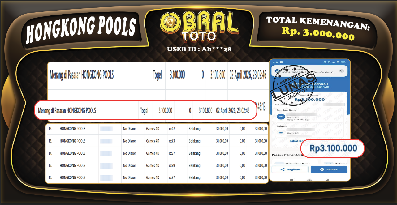 Kami merayakan selamat kepada salah satu pemain setia situs OBRALTOTO yang berhasil meraih kemenangan besar senilai Rp 6.000.000 dalam permainan HONGKONG POOLS pada tanggal 04 APRIL 2026 . Kemenangan ini telah kami proses dan pemahaman secara LUNAS ke rekening yang terdaftar. Semoga kemenangan ini menjadi motivasi bagi pemain lainnya untuk terus mencoba keberuntungan dan menikmati permainan di OBRALTOTO .