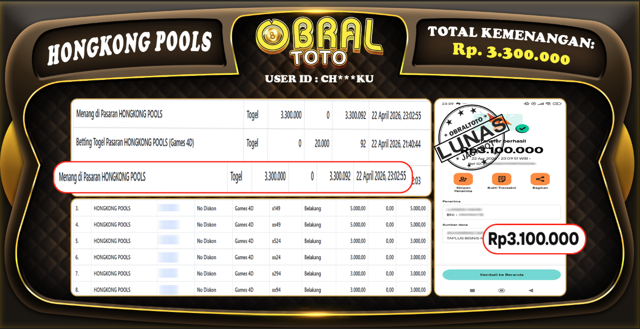Kami merayakan selamat kepada salah satu pemain setia situs OBRALTOTO yang berhasil meraih kemenangan besar senilai Rp 3.300.000 dalam permainan HONGKONG POOLS pada tanggal 23 APRIL 2026 . Kemenangan ini telah kami proses dan pemahaman secara LUNAS ke rekening yang terdaftar. Semoga kemenangan ini menjadi motivasi bagi pemain lainnya untuk terus mencoba keberuntungan dan menikmati permainan di OBRALTOTO .