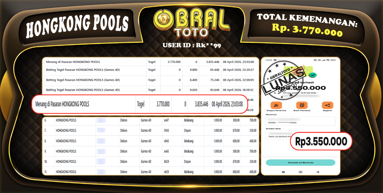 Kami merayakan selamat kepada salah satu pemain setia situs OBRALTOTO yang berhasil meraih kemenangan besar senilai Rp 3.770.000 dalam permainan HONGKONG POOLS pada tanggal 10 APRIL 2026 . Kemenangan ini telah kami proses dan pemahaman secara LUNAS ke rekening yang terdaftar. Semoga kemenangan ini menjadi motivasi bagi pemain lainnya untuk terus mencoba keberuntungan dan menikmati permainan di OBRALTOTO .