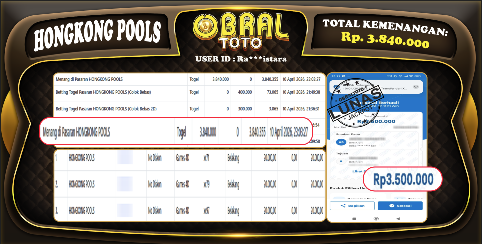 Kami merayakan selamat kepada salah satu pemain setia situs OBRALTOTO yang berhasil meraih kemenangan besar senilai Rp 3.840.000 dalam permainan HONGKONG POOLS pada tanggal 11 APRIL 2026 . Kemenangan ini telah kami proses dan pemahaman secara LUNAS ke rekening yang terdaftar. Semoga kemenangan ini menjadi motivasi bagi pemain lainnya untuk terus mencoba keberuntungan dan menikmati permainan di OBRALTOTO .