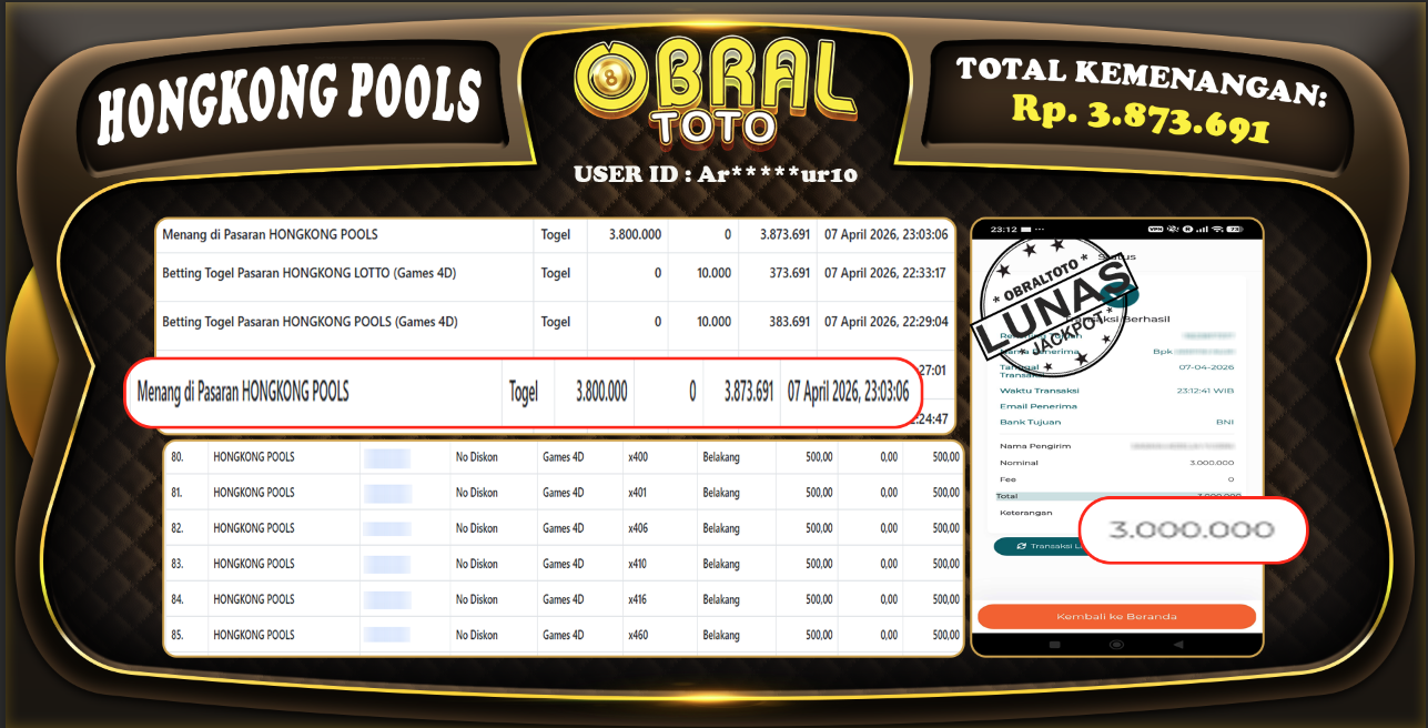 Kami merayakan selamat kepada salah satu pemain setia situs OBRALTOTO yang berhasil meraih kemenangan besar senilai Rp 3.873.691 dalam permainan HONGKONG POOLS pada tanggal 08 APRIL 2026 . Kemenangan ini telah kami proses dan pemahaman secara LUNAS ke rekening yang terdaftar. Semoga kemenangan ini menjadi motivasi bagi pemain lainnya untuk terus mencoba keberuntungan dan menikmati permainan di OBRALTOTO .