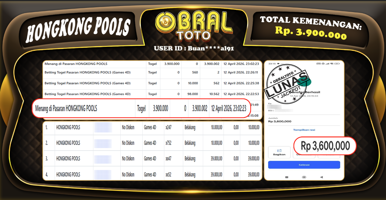 Kami merayakan selamat kepada salah satu pemain setia situs OBRALTOTO yang berhasil meraih kemenangan besar senilai Rp 3.900.000 dalam permainan HONGKONG POOLS pada tanggal 13 APRIL 2026 . Kemenangan ini telah kami proses dan pemahaman secara LUNAS ke rekening yang terdaftar. Semoga kemenangan ini menjadi motivasi bagi pemain lainnya untuk terus mencoba keberuntungan dan menikmati permainan di OBRALTOTO .