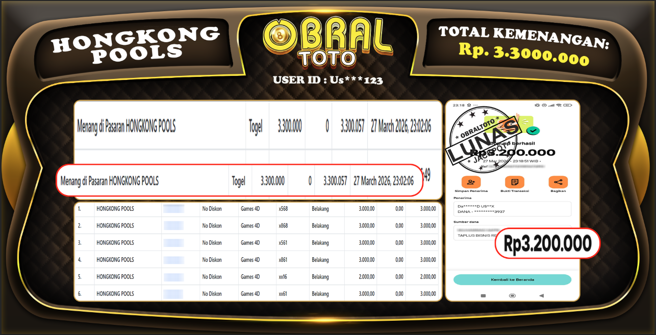 Kami merayakan selamat kepada salah satu pemain setia situs OBRALTOTO yang berhasil meraih kemenangan besar senilai Rp 3,300,000 dalam permainan HONGKONG POOLS pada tanggal 28 MARET 2026. Kemenangan ini telah kami proses dan pemahaman secara LUNAS ke rekening yang terdaftar. Semoga kemenangan ini menjadi motivasi bagi pemain lainnya untuk terus mencoba keberuntungan dan menikmati permainan di OBRALTOTO .
