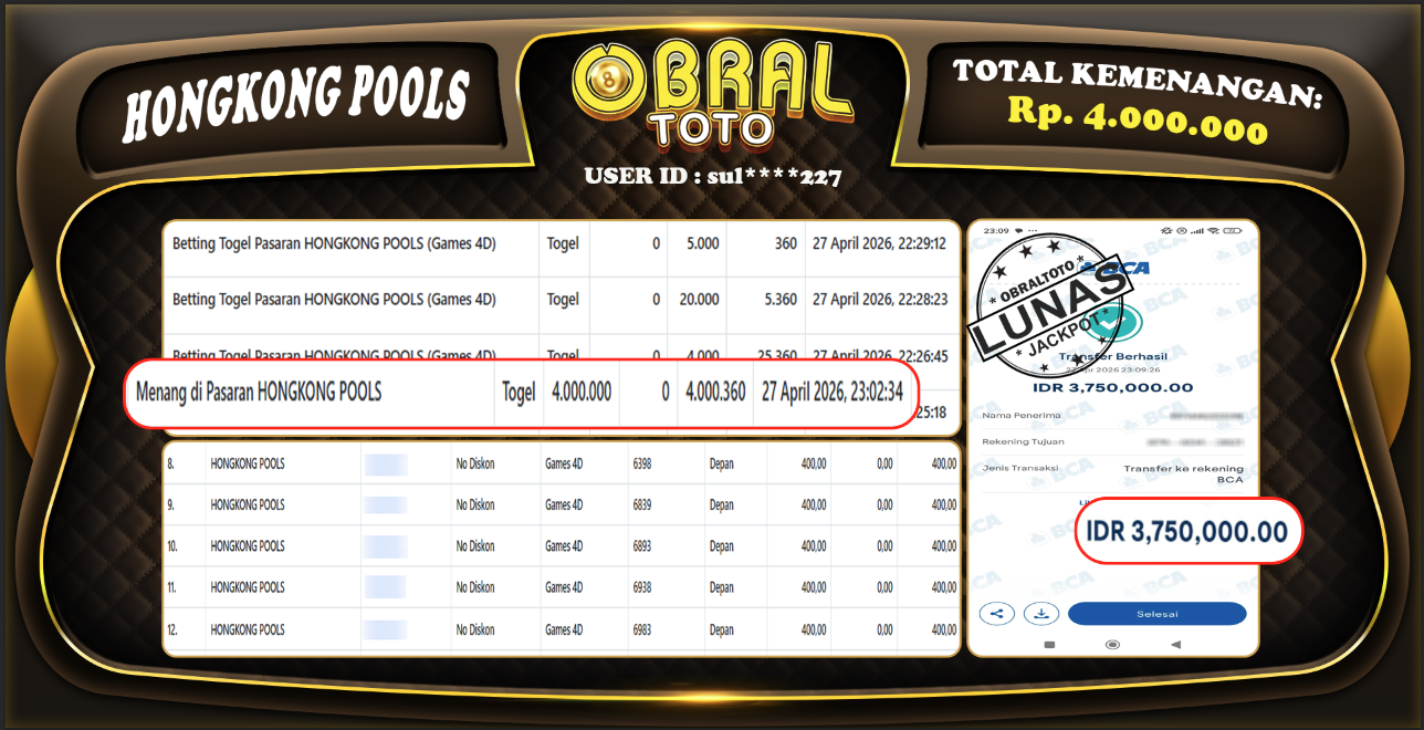 Kami merayakan selamat kepada salah satu pemain setia situs OBRALTOTO yang berhasil meraih kemenangan besar senilai Rp 4.000.000 dalam permainan HONGKONG POOLS pada tanggal 28 APRIL 2026 . Kemenangan ini telah kami proses dan pemahaman secara LUNAS ke rekening yang terdaftar. Semoga kemenangan ini menjadi motivasi bagi pemain lainnya untuk terus mencoba keberuntungan dan menikmati permainan di OBRALTOTO .