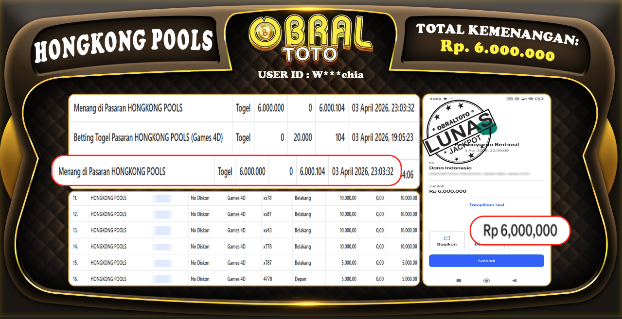 Kami merayakan selamat kepada salah satu pemain setia situs OBRALTOTO yang berhasil meraih kemenangan besar senilai Rp 6.000.000 dalam permainan HONGKONG POOLS pada tanggal 04 APRIL 2026 . Kemenangan ini telah kami proses dan pemahaman secara LUNAS ke rekening yang terdaftar. Semoga kemenangan ini menjadi motivasi bagi pemain lainnya untuk terus mencoba keberuntungan dan menikmati permainan di OBRALTOTO .