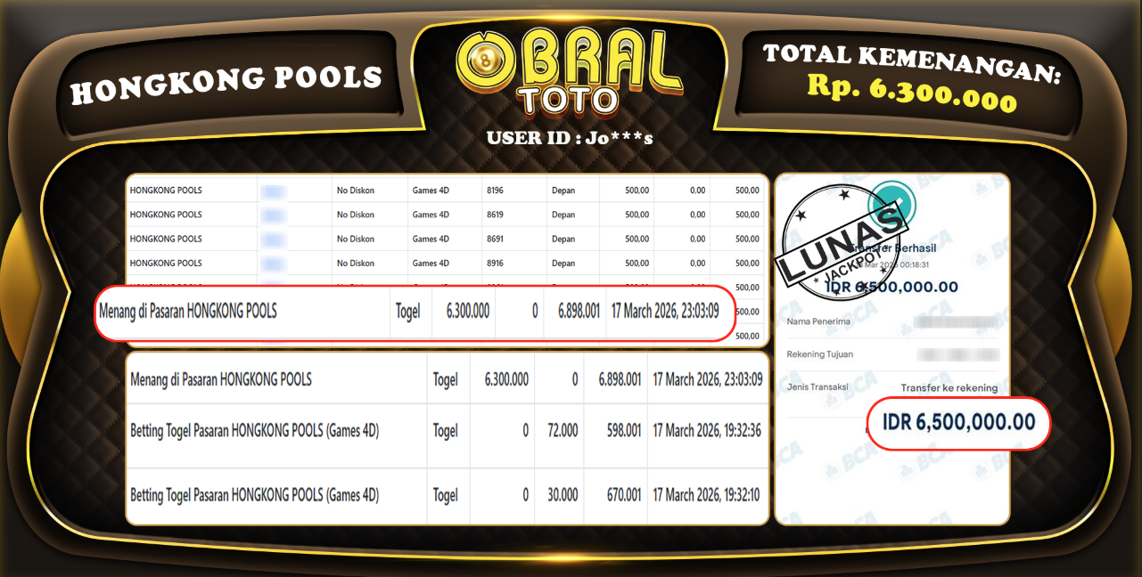 Kami merayakan selamat kepada salah satu pemain setia situs OBRALTOTO yang berhasil meraih kemenangan besar senilai Rp 6,300,000 dalam permainan HONGKONG POOLS pada tanggal 20 MARET. Kemenangan ini telah kami proses dan pemahaman secara LUNAS ke rekening yang terdaftar. Semoga kemenangan ini menjadi motivasi bagi pemain lainnya untuk terus mencoba keberuntungan dan menikmati permainan di OBRALTOTO .