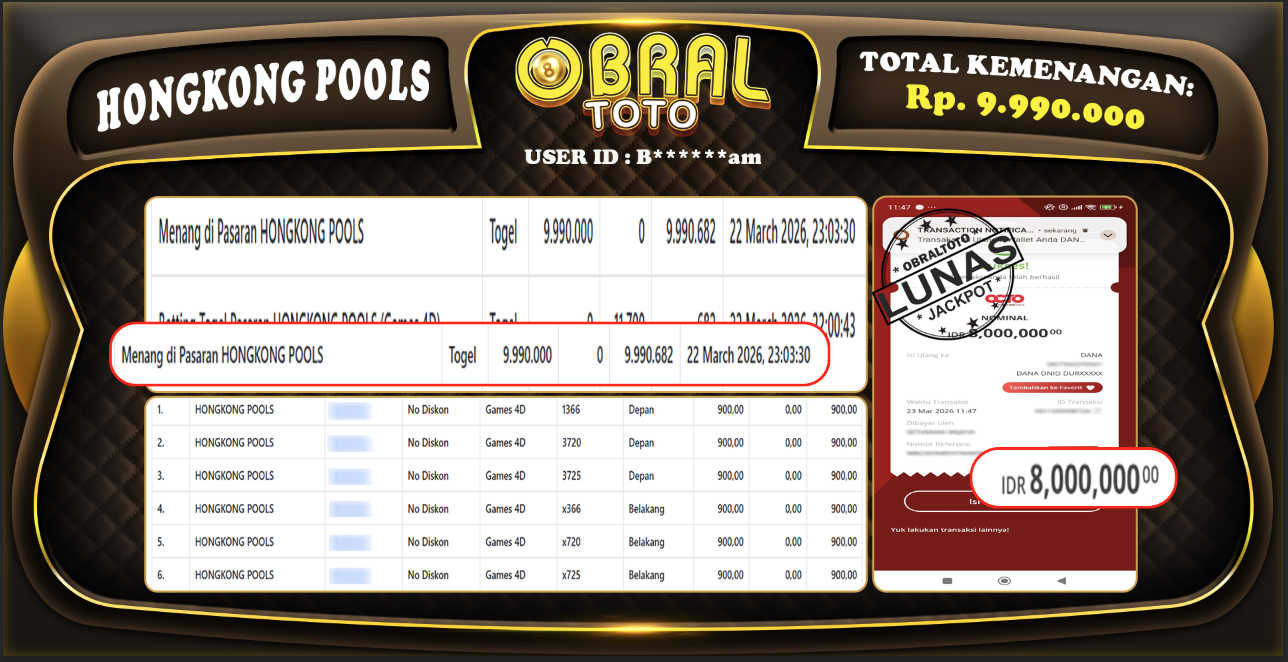 Kami merayakan selamat kepada salah satu pemain setia situs OBRALTOTO yang berhasil meraih kemenangan besar senilai Rp 9,990,000 dalam permainan HONGKONG POOLS pada tanggal 24 MARET 2026. Kemenangan ini telah kami proses dan pemahaman secara LUNAS ke rekening yang terdaftar. Semoga kemenangan ini menjadi motivasi bagi pemain lainnya untuk terus mencoba keberuntungan dan menikmati permainan di OBRALTOTO .