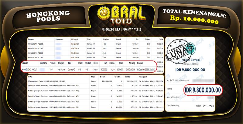 Kami merayakan selamat kepada salah satu pemain setia situs OBRALTOTO yang berhasil meraih kemenangan besar senilai Rp,10.000.000 dalam permainan HONGKONG POOLS pada tanggal 12 October 2025. Kemenangan ini telah kami proses dan pemahaman secara LUNAS ke rekening yang terdaftar. Semoga kemenangan ini menjadi motivasi bagi pemain lainnya untuk terus mencoba keberuntungan dan menikmati permainan di OBRALTOTO .