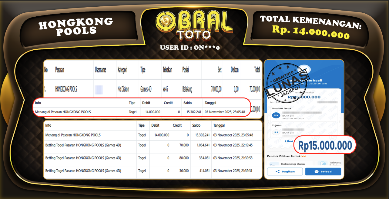 Kami merayakan selamat kepada salah satu pemain setia situs OBRALTOTO yang berhasil meraih kemenangan besar senilai Rp,14.000.000 dalam permainan HONGKONG POOLS pada tanggal 04 November 2025. Kemenangan ini telah kami proses dan pemahaman secara LUNAS ke rekening yang terdaftar. Semoga kemenangan ini menjadi motivasi bagi pemain lainnya untuk terus mencoba keberuntungan dan menikmati permainan di OBRALTOTO .