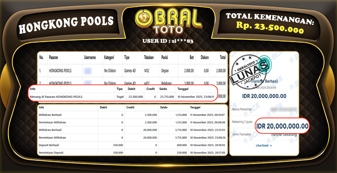 Kami merayakan selamat kepada salah satu pemain setia situs OBRALTOTO yang berhasil meraih kemenangan besar senilai Rp,23.500.000 dalam permainan HONGKONG POOLS pada tanggal 11 November 2025. Kemenangan ini telah kami proses dan pemahaman secara LUNAS ke rekening yang terdaftar. Semoga kemenangan ini menjadi motivasi bagi pemain lainnya untuk terus mencoba keberuntungan dan menikmati permainan di OBRALTOTO .