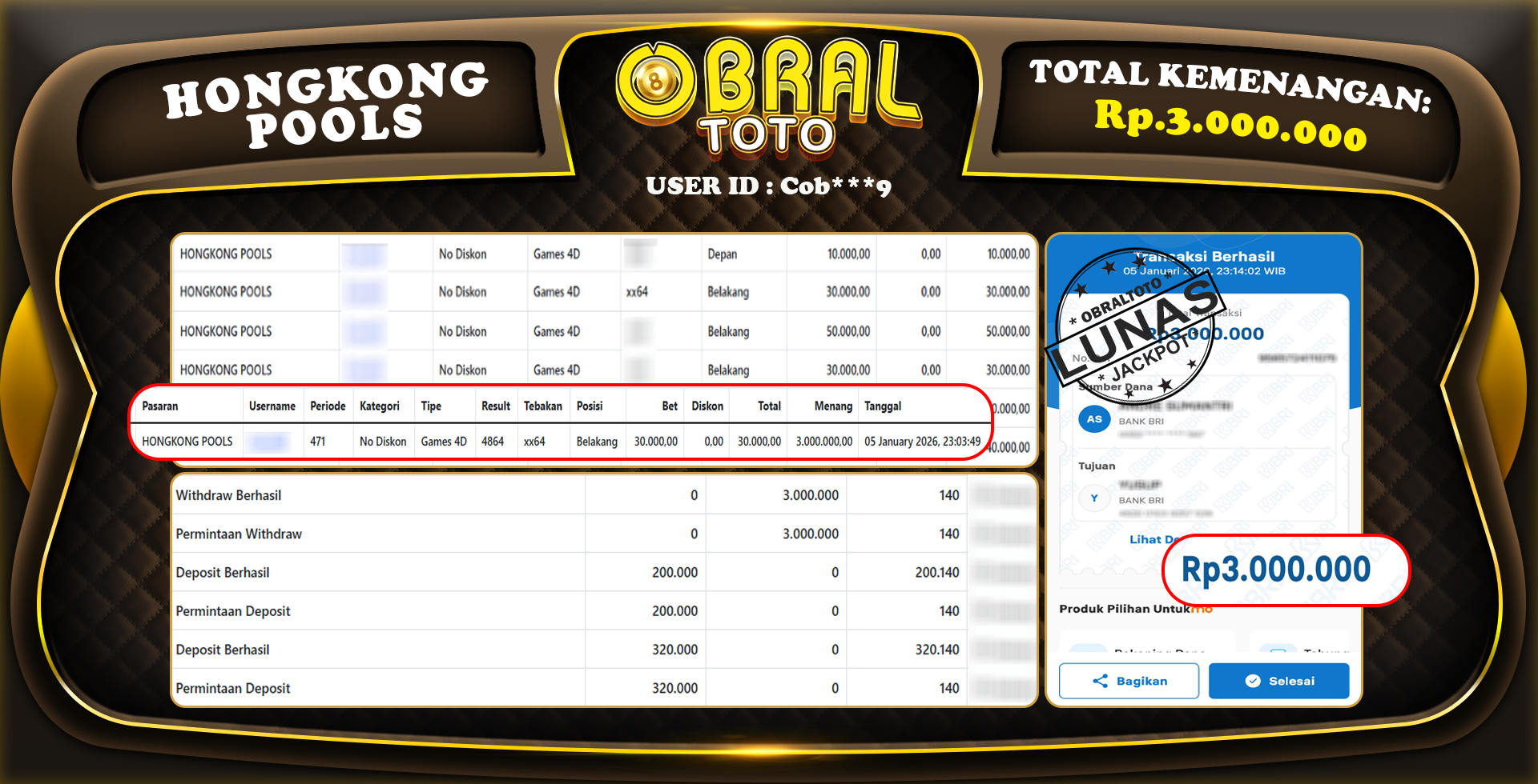 Kami merayakan selamat kepada salah satu pemain setia situs OBRALTOTO yang berhasil meraih kemenangan besar senilai Rp,3.000.000 dalam permainan HONGKONG POOLS pada tanggal 06 JANUARY 2026. Kemenangan ini telah kami proses dan pemahaman secara LUNAS ke rekening yang terdaftar. Semoga kemenangan ini menjadi motivasi bagi pemain lainnya untuk terus mencoba keberuntungan dan menikmati permainan di OBRALTOTO .
