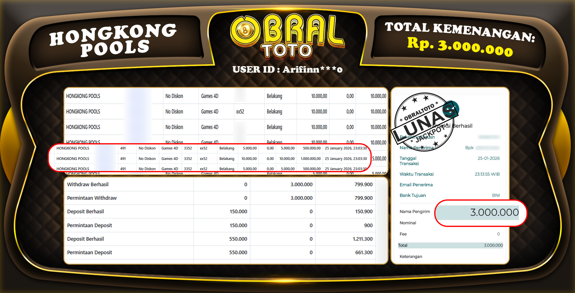 Kami merayakan selamat kepada salah satu pemain setia situs OBRALTOTO yang berhasil meraih kemenangan besar senilai Rp,3.850.000 dalam permainan HONGKONG POOLS pada tanggal 27 JANUARY 2026. Kemenangan ini telah kami proses dan pemahaman secara LUNAS ke rekening yang terdaftar. Semoga kemenangan ini menjadi motivasi bagi pemain lainnya untuk terus mencoba keberuntungan dan menikmati permainan di OBRALTOTO .