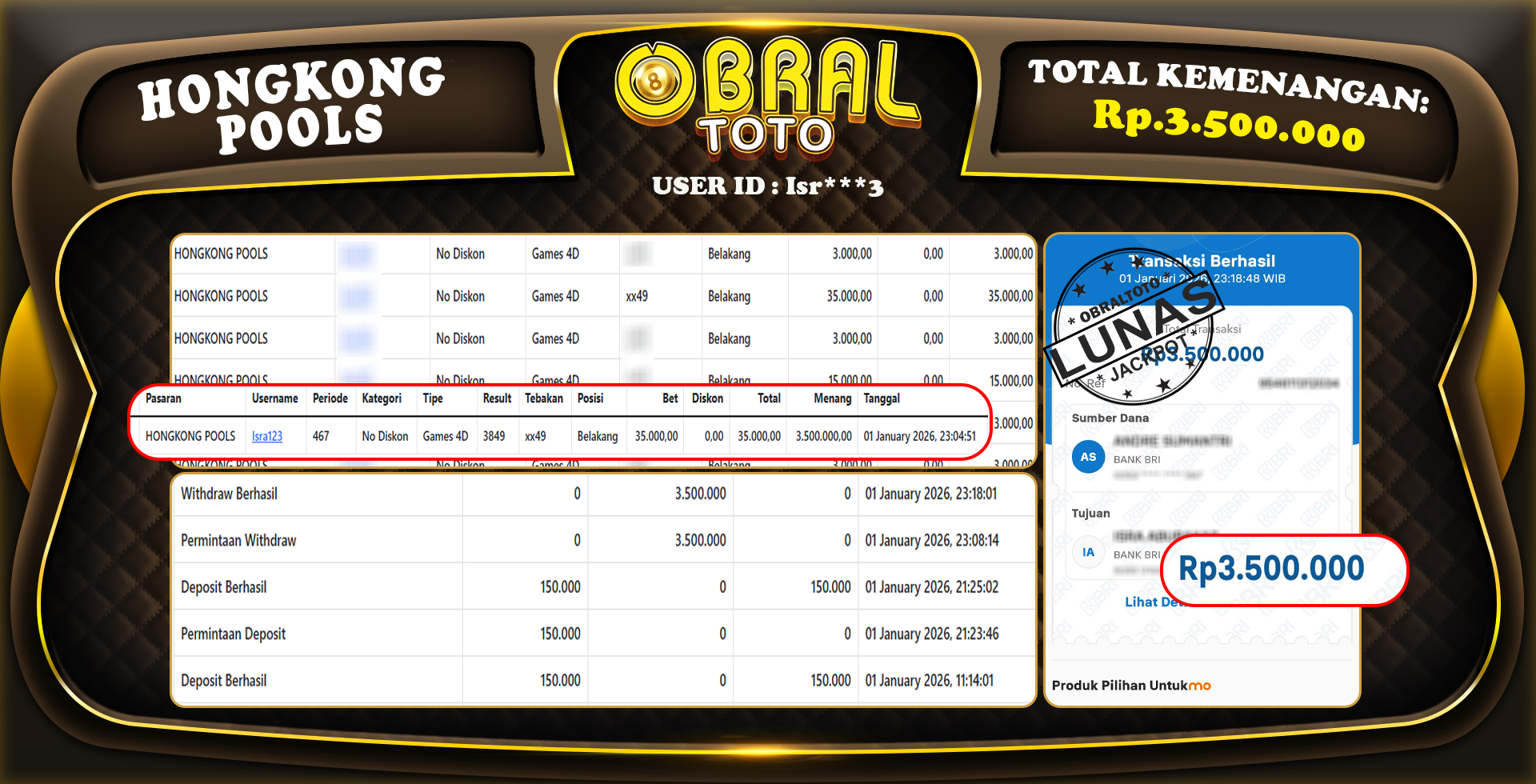 Kami merayakan selamat kepada salah satu pemain setia situs OBRALTOTO yang berhasil meraih kemenangan besar senilai Rp,3.500.000 dalam permainan HONGKONG POOLS pada tanggal 02 JANUARY 2026. Kemenangan ini telah kami proses dan pemahaman secara LUNAS ke rekening yang terdaftar. Semoga kemenangan ini menjadi motivasi bagi pemain lainnya untuk terus mencoba keberuntungan dan menikmati permainan di OBRALTOTO .