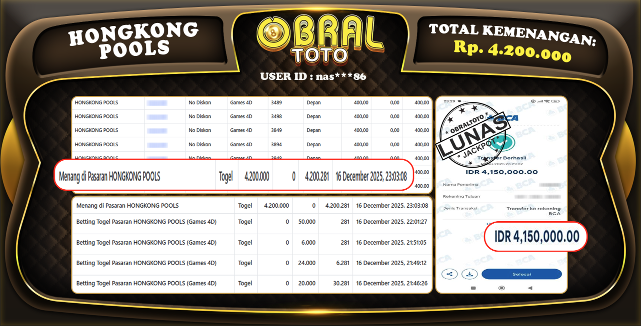 Kami merayakan selamat kepada salah satu pemain setia situs OBRALTOTO yang berhasil meraih kemenangan besar senilai Rp,4.200.000 dalam permainan HONGKONG POOLS pada tanggal 17 Desember 2025. Kemenangan ini telah kami proses dan pemahaman secara LUNAS ke rekening yang terdaftar. Semoga kemenangan ini menjadi motivasi bagi pemain lainnya untuk terus mencoba keberuntungan dan menikmati permainan di OBRALTOTO .