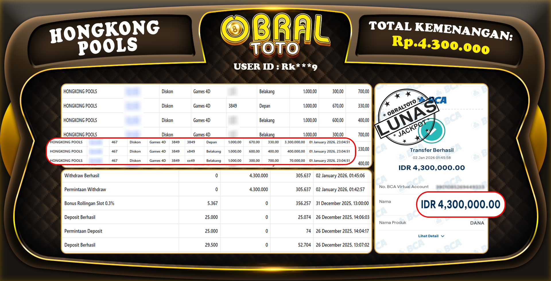 Kami merayakan selamat kepada salah satu pemain setia situs OBRALTOTO yang berhasil meraih kemenangan besar senilai Rp,4.300.000 dalam permainan HONGKONG POOLS pada tanggal 03 JANUARY 2026. Kemenangan ini telah kami proses dan pemahaman secara LUNAS ke rekening yang terdaftar. Semoga kemenangan ini menjadi motivasi bagi pemain lainnya untuk terus mencoba keberuntungan dan menikmati permainan di OBRALTOTO .