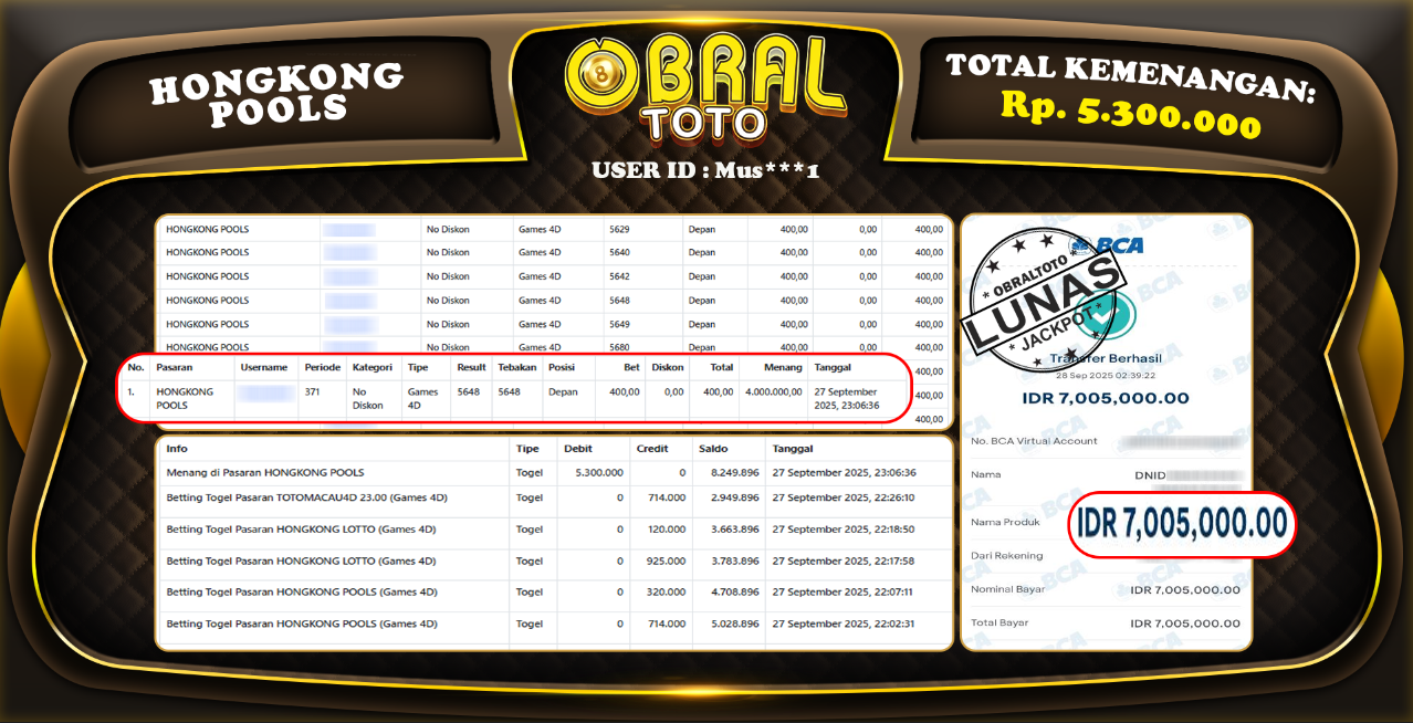 Kami merayakan selamat kepada salah satu pemain setia situs OBRALTOTO yang berhasil meraih kemenangan besar senilai Rp,5.300.000 dalam permainan HONGKONG POOLS pada tanggal 28 September 2025. Kemenangan ini telah kami proses dan pemahaman secara LUNAS ke rekening yang terdaftar. Semoga kemenangan ini menjadi motivasi bagi pemain lainnya untuk terus mencoba keberuntungan dan menikmati permainan di OBRALTOTO .