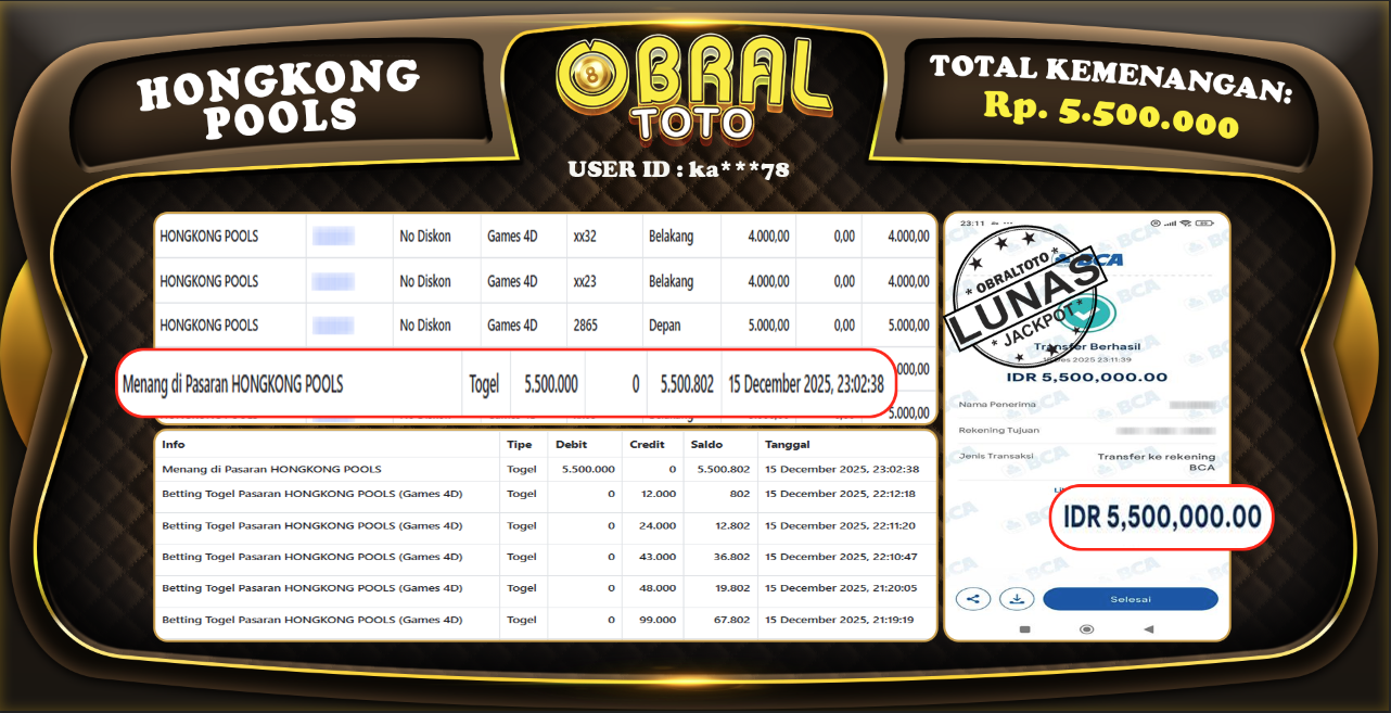 Kami merayakan selamat kepada salah satu pemain setia situs OBRALTOTO yang berhasil meraih kemenangan besar senilai Rp,5.500.000 dalam permainan HONGKONG POOLS pada tanggal 16 Desember 2025. Kemenangan ini telah kami proses dan pemahaman secara LUNAS ke rekening yang terdaftar. Semoga kemenangan ini menjadi motivasi bagi pemain lainnya untuk terus mencoba keberuntungan dan menikmati permainan di OBRALTOTO .