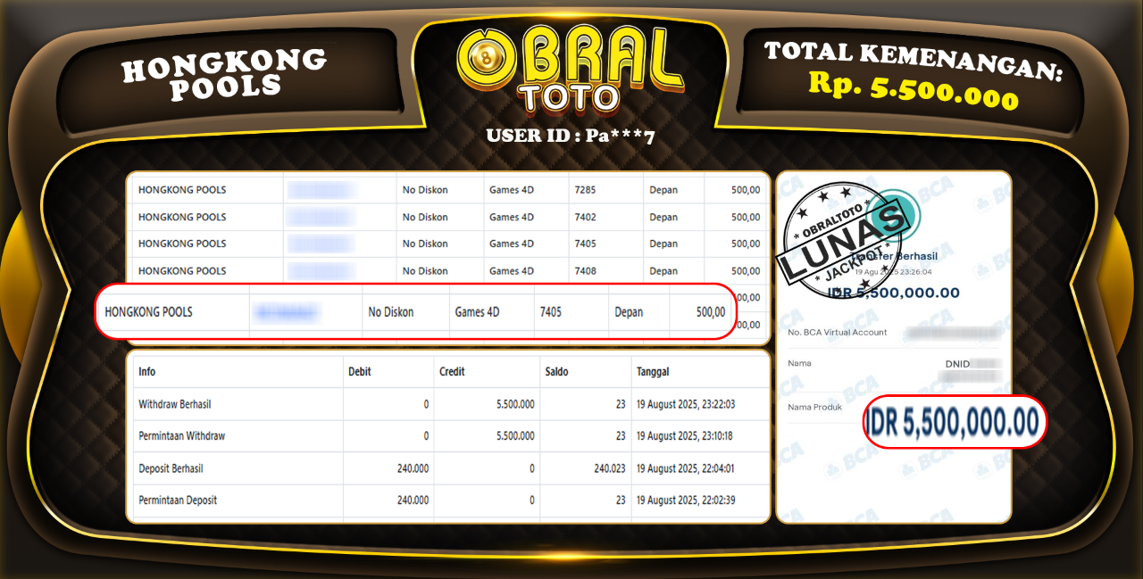 Kami merayakan selamat kepada salah satu pemain setia situs OBRALTOTO yang berhasil meraih kemenangan besar senilai Rp,5.500.000 dalam permainan HONGKONG POOLS pada tanggal 19 Agustus 2025. Kemenangan ini telah kami proses dan pemahaman secara LUNAS ke rekening yang terdaftar. Semoga kemenangan ini menjadi motivasi bagi pemain lainnya untuk terus mencoba keberuntungan dan menikmati permainan di OBRALTOTO .