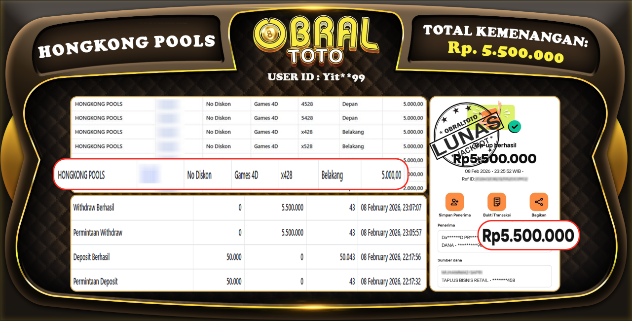 Kami merayakan selamat kepada salah satu pemain setia situs OBRALTOTO yang berhasil meraih kemenangan besar senilai Rp,5.500.000 dalam permainan HONGKONG POOLS pada tanggal 009 FEBRUARY 2026. Kemenangan ini telah kami proses dan pemahaman secara LUNAS ke rekening yang terdaftar. Semoga kemenangan ini menjadi motivasi bagi pemain lainnya untuk terus mencoba keberuntungan dan menikmati permainan di OBRALTOTO .