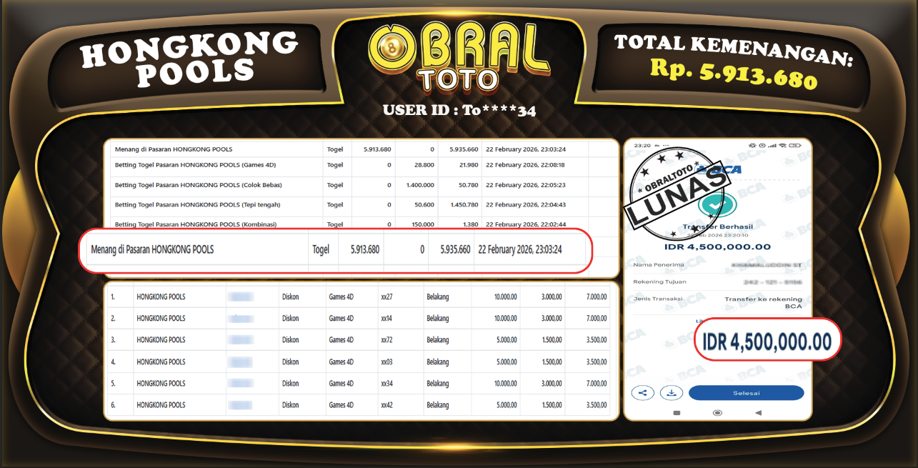 JACKPOT HONGKONG POOLS OBRALTOTO 23 FEBRUARY 2026