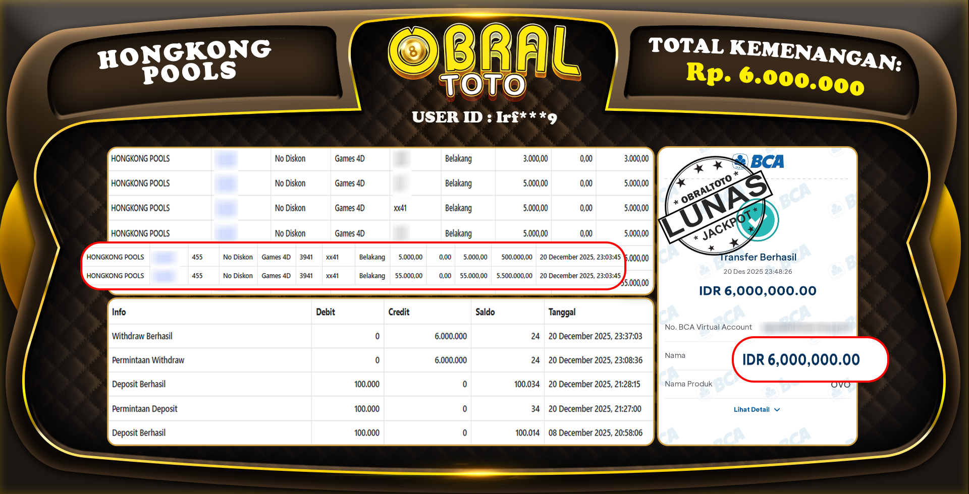 Kami merayakan selamat kepada salah satu pemain setia situs OBRALTOTO yang berhasil meraih kemenangan besar senilai Rp,6.000.000 dalam permainan HONGKONG POOLS pada tanggal 21 Desember 2025. Kemenangan ini telah kami proses dan pemahaman secara LUNAS ke rekening yang terdaftar. Semoga kemenangan ini menjadi motivasi bagi pemain lainnya untuk terus mencoba keberuntungan dan menikmati permainan di OBRALTOTO .