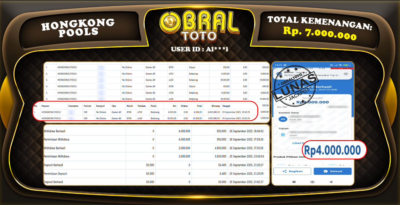 Kami merayakan selamat kepada salah satu pemain setia situs OBRALTOTO yang berhasil meraih kemenangan besar senilai Rp,7.000.000 dalam permainan HONGKONG POOLS pada tanggal 26 September 2025. Kemenangan ini telah kami proses dan pemahaman secara LUNAS ke rekening yang terdaftar. Semoga kemenangan ini menjadi motivasi bagi pemain lainnya untuk terus mencoba keberuntungan dan menikmati permainan di OBRALTOTO .