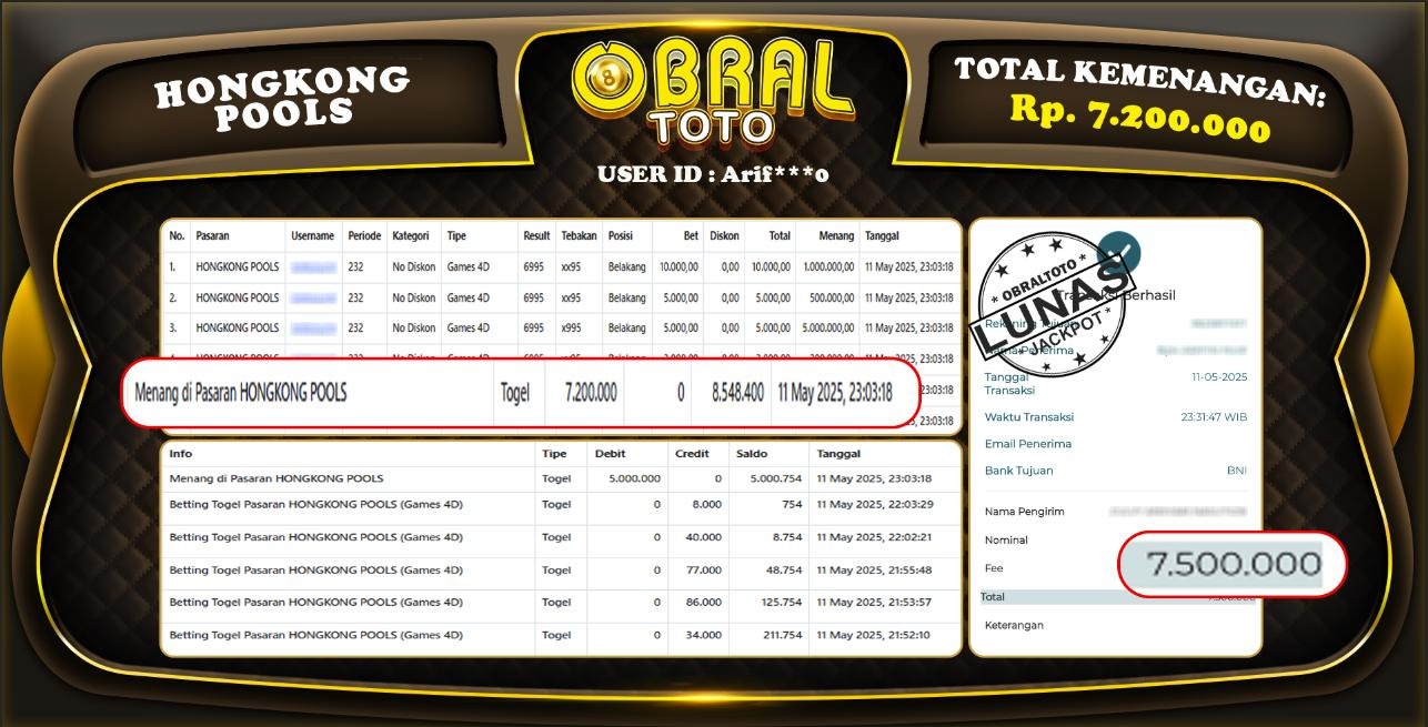 OBRALTOTO – Selamat Kepada Pemenang User id :Arif***o JP HONGKONG POOLS Rp,7.200.000.-11 MEI 2025- Situs game online terpercaya dengan bukti jp yang telah resmi dan terjamin di Indonesia, memberikan pengalaman bermain yang aman dan menyenangkan bagi para penggemar game online. Dengan hadirnya OBRALTOTO , pemain dapat menikmati kemudahan akses ke berbagai permainan seru, peluang memenangkan hadiah besar, serta keuntungan menarik yang telah disiapkan khusus untuk para member lama maupun member baru. Platform ini dirancang untuk memberikan kenyamanan dan keamanan, sehingga setiap pemain dapat fokus menikmati permainan sekaligus meraih keuntungan maksimal.