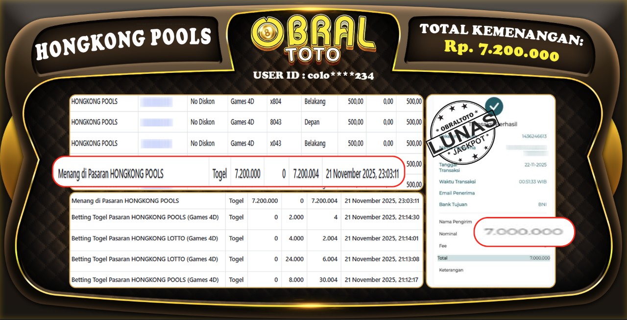 Kami merayakan selamat kepada salah satu pemain setia situs OBRALTOTO yang berhasil meraih kemenangan besar senilai Rp,7.200.000 dalam permainan HONGKONG POOLS pada tanggal 22 November 2025. Kemenangan ini telah kami proses dan pemahaman secara LUNAS ke rekening yang terdaftar. Semoga kemenangan ini menjadi motivasi bagi pemain lainnya untuk terus mencoba keberuntungan dan menikmati permainan di OBRALTOTO .