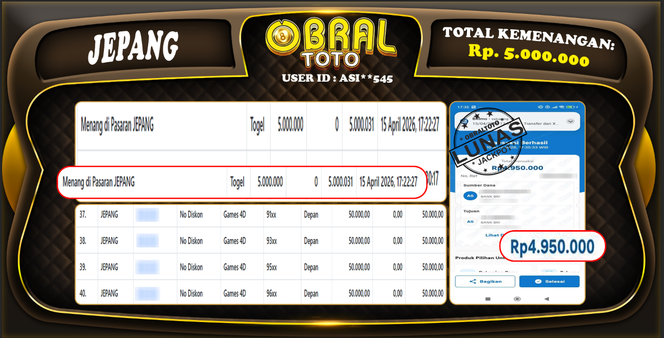 Kami merayakan selamat kepada salah satu pemain setia situs OBRALTOTO yang berhasil meraih kemenangan besar senilai Rp,5.000.00 dalam permainan JEPANG pada tanggal 16 APRIL 2026. Kemenangan ini telah kami proses dan pemahaman secara LUNAS ke rekening yang terdaftar. Semoga kemenangan ini menjadi motivasi bagi pemain lainnya untuk terus mencoba keberuntungan dan menikmati permainan di OBRALTOTO .