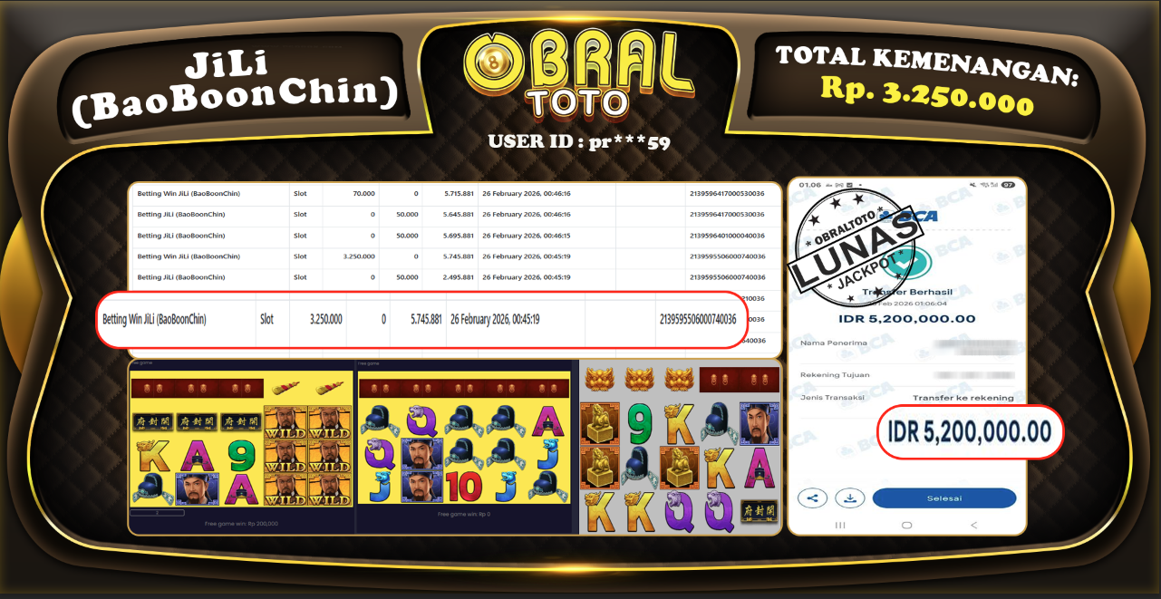 Kami merayakan selamat kepada salah satu pemain setia situs OBRALTOTO yang berhasil meraih kemenangan besar senilai Rp,3.000.000 dalam permainan JILI BAOBOONCHIN pada tanggal 26 FEBRUARY 2026. Kemenangan ini telah kami proses dan pemahaman secara LUNAS ke rekening yang terdaftar. Semoga kemenangan ini menjadi motivasi bagi pemain lainnya untuk terus mencoba keberuntungan dan menikmati permainan di OBRALTOTO .