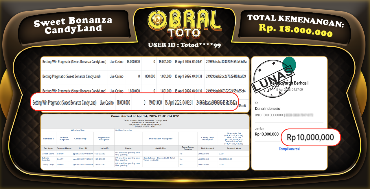 JACKPOT SWEET BONANZA CANDYLAND OBRALTOTO 20 APRIL 2026