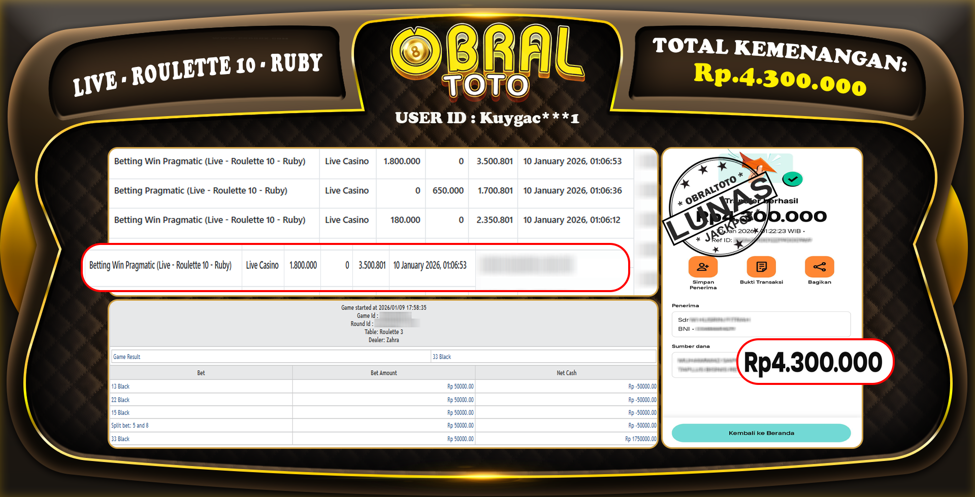 OBRALTOTO – Selamat Kepada Pemenang User id : Kuygae***1 JP LIVE – ROULETTE 10 – RUBY 4.300.000 Juta 10 JANUARY 2026 – Situs game online terpercaya dengan bukti jp yang telah resmi dan terjamin di Indonesia, memberikan pengalaman bermain yang aman dan menyenangkan bagi para penggemar game online. Dengan hadirnya OBRALTOTO , pemain dapat menikmati kemudahan akses ke berbagai permainan seru, peluang memenangkan hadiah besar, serta keuntungan menarik yang telah disiapkan khusus untuk para member lama maupun member baru. Platform ini dirancang untuk memberikan kenyamanan dan keamanan, sehingga setiap pemain dapat fokus menikmati permainan sekaligus meraih keuntungan maksimal.4.300.000