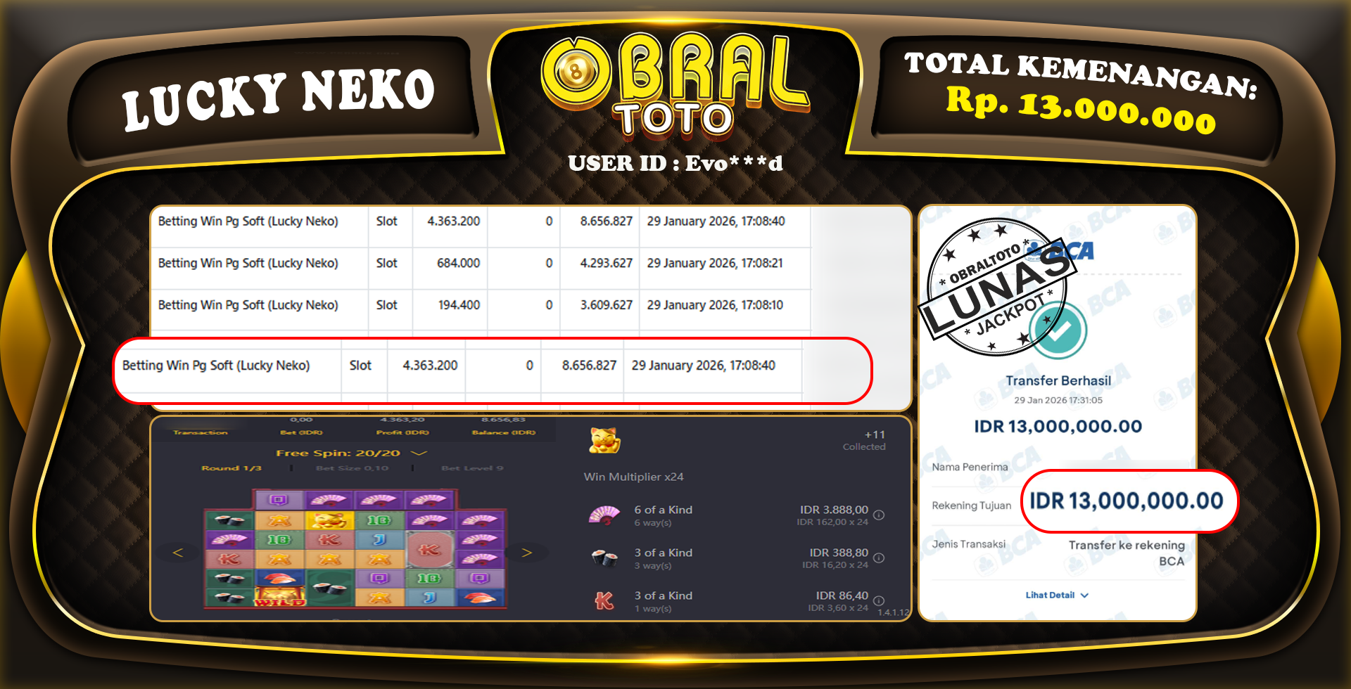 Kami merayakan selamat kepada salah satu pemain setia situs OBRALTOTO yang berhasil meraih kemenangan besar senilai Rp,13.000.000 dalam permainan LUCKY NEKO  pada tanggal 30 JANUARY 2026. Kemenangan ini telah kami proses dan pemahaman secara LUNAS ke rekening yang terdaftar. Semoga kemenangan ini menjadi motivasi bagi pemain lainnya untuk terus mencoba keberuntungan dan menikmati permainan di OBRALTOTO .