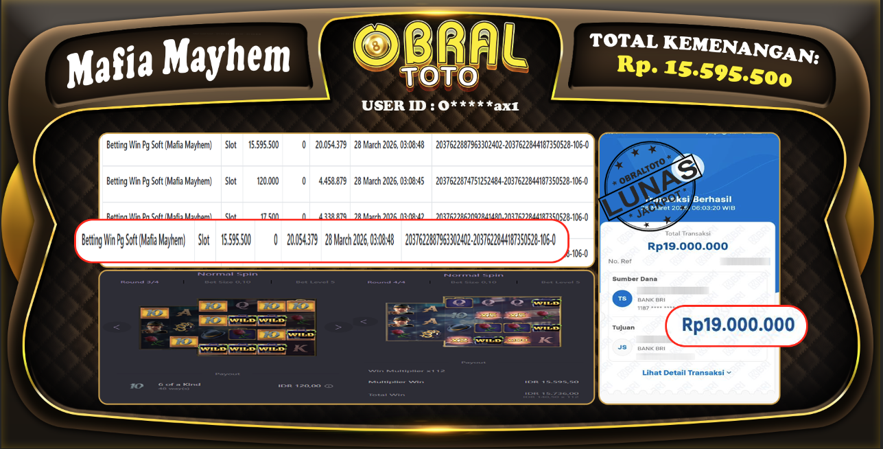 Kami merayakan selamat kepada salah satu pemain setia situs OBRALTOTO yang berhasil meraih kemenangan besar senilai Rp,15.595.500dalam permainan MAFIA MAYHEM pada tanggal 29 MARET 2026. Kemenangan ini telah kami proses dan pemahaman secara LUNAS ke rekening yang terdaftar. Semoga kemenangan ini menjadi motivasi bagi pemain lainnya untuk terus mencoba keberuntungan dan menikmati permainan di OBRALTOTO .
