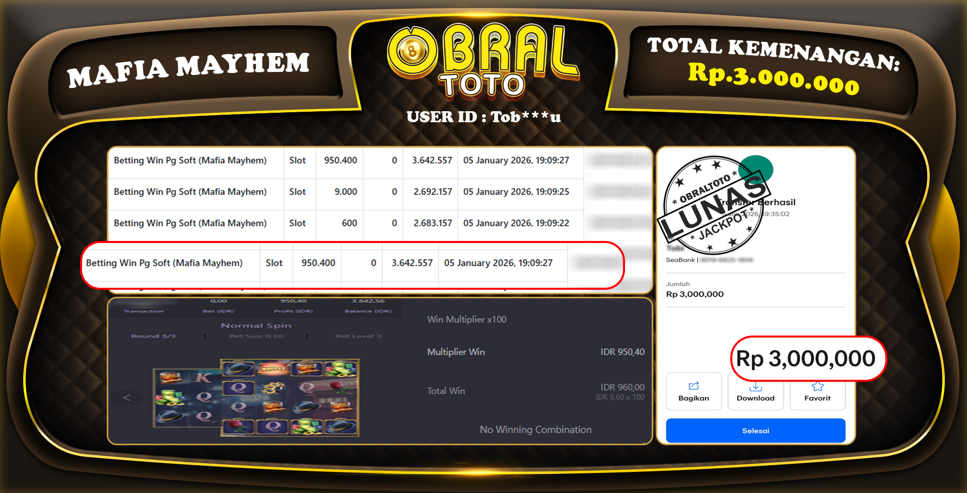 Kami merayakan selamat kepada salah satu pemain setia situs OBRALTOTO yang berhasil meraih kemenangan besar senilai Rp,3.000.000 dalam permainan MAFIA MAYHEM pada tanggal 06 January 2026. Kemenangan ini telah kami proses dan pemahaman secara LUNAS ke rekening yang terdaftar. Semoga kemenangan ini menjadi motivasi bagi pemain lainnya untuk terus mencoba keberuntungan dan menikmati permainan di OBRALTOTO .