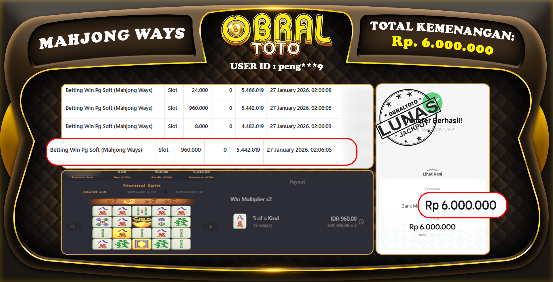 OBRALTOTO   – Selamat Kepada Pemenang User id : Pengxxxxxxxp JP MAHJONG WAYS  Rp,6.000.000 29 January 2026- Situs game online terpercaya dengan bukti jp yang telah resmi dan terjamin di Indonesia, memberikan pengalaman bermain yang aman dan menyenangkan bagi para penggemar game online. Dengan hadirnya OBRALTOTO , pemain dapat menikmati kemudahan akses ke berbagai permainan seru, peluang memenangkan hadiah besar, serta keuntungan menarik yang telah disiapkan khusus untuk para member lama maupun member baru. Platform ini dirancang untuk memberikan kenyamanan dan keamanan, sehingga setiap pemain dapat fokus menikmati permainan sekaligus meraih keuntungan maksimal.