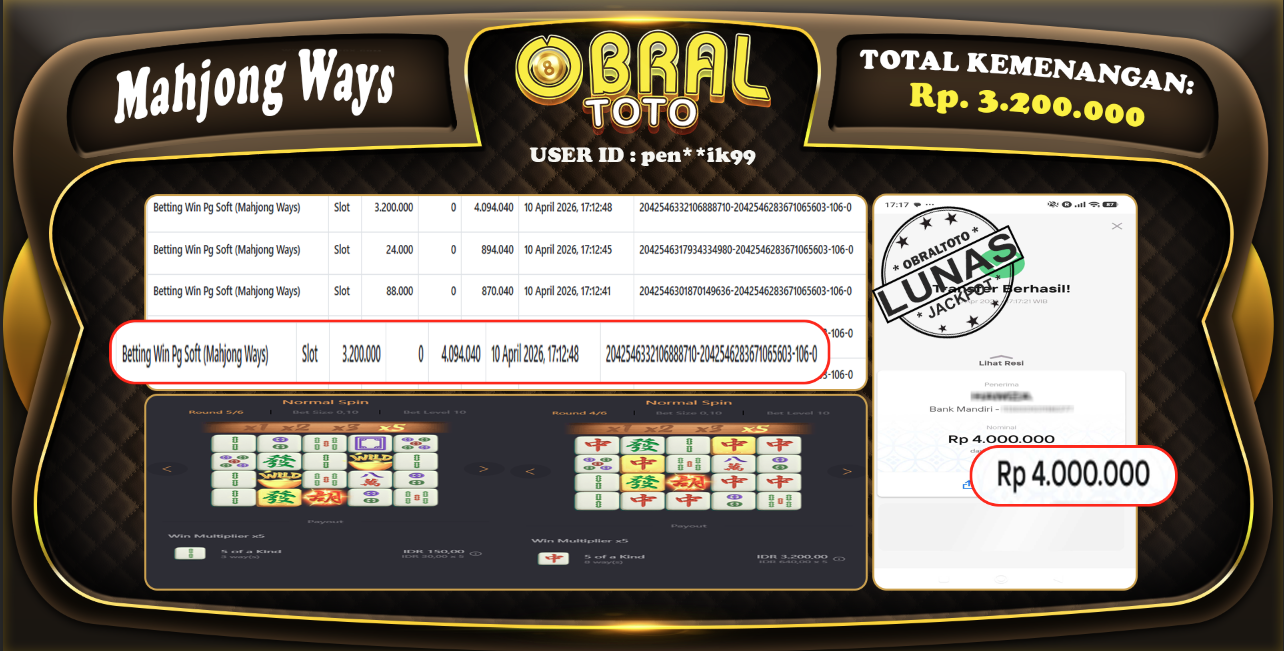 OBRALTOTO – Selamat Kepada Pemenang User id : Pen**ik99 JP MAHJONG WAYS Rp 3.200.000 Juta 11 APRIL 2026 – Situs game online terpercaya dengan bukti jp yang telah resmi dan terjamin di Indonesia, memberikan pengalaman bermain yang aman dan menyenangkan bagi para penggemar game online. Dengan hadirnya OBRALTOTO , pemain dapat menikmati kemudahan akses ke berbagai permainan seru, peluang memenangkan hadiah besar, serta keuntungan menarik yang telah disiapkan khusus untuk para member lama maupun member baru. Platform ini dirancang untuk memberikan kenyamanan dan keamanan, sehingga setiap pemain dapat fokus menikmati permainan sekaligus meraih keuntungan maksimal.