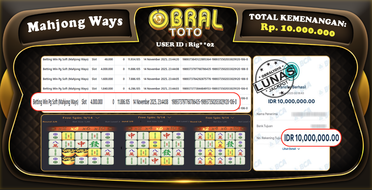 OBRALTOTO   – Selamat Kepada Pemenang User id : Rig**02 JP MAHJONG WAYS  Rp,10.000.000 15 November 2025- Situs game online terpercaya dengan bukti jp yang telah resmi dan terjamin di Indonesia, memberikan pengalaman bermain yang aman dan menyenangkan bagi para penggemar game online. Dengan hadirnya OBRALTOTO , pemain dapat menikmati kemudahan akses ke berbagai permainan seru, peluang memenangkan hadiah besar, serta keuntungan menarik yang telah disiapkan khusus untuk para member lama maupun member baru. Platform ini dirancang untuk memberikan kenyamanan dan keamanan, sehingga setiap pemain dapat fokus menikmati permainan sekaligus meraih keuntungan maksimal.