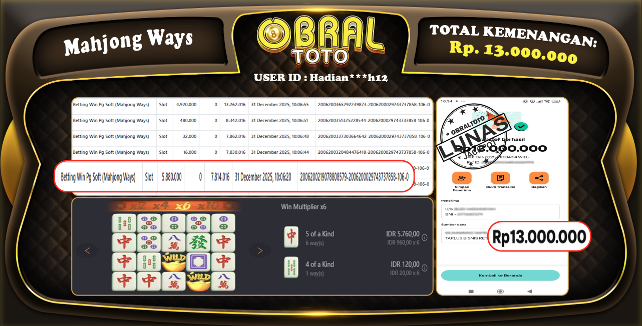 OBRALTOTO – Selamat Kepada Pemenang User id : Hadian***h12 JP MAHJONG WAYS Rp,13.000.000 31 Desember 2025- Situs game online terpercaya dengan bukti jp yang telah resmi dan terjamin di Indonesia, memberikan pengalaman bermain yang aman dan menyenangkan bagi para penggemar game online. Dengan hadirnya OBRALTOTO , pemain dapat menikmati kemudahan akses ke berbagai permainan seru, peluang memenangkan hadiah besar, serta keuntungan menarik yang telah disiapkan khusus untuk para member lama maupun member baru. Platform ini dirancang untuk memberikan kenyamanan dan keamanan, sehingga setiap pemain dapat fokus menikmati permainan sekaligus meraih keuntungan maksimal.