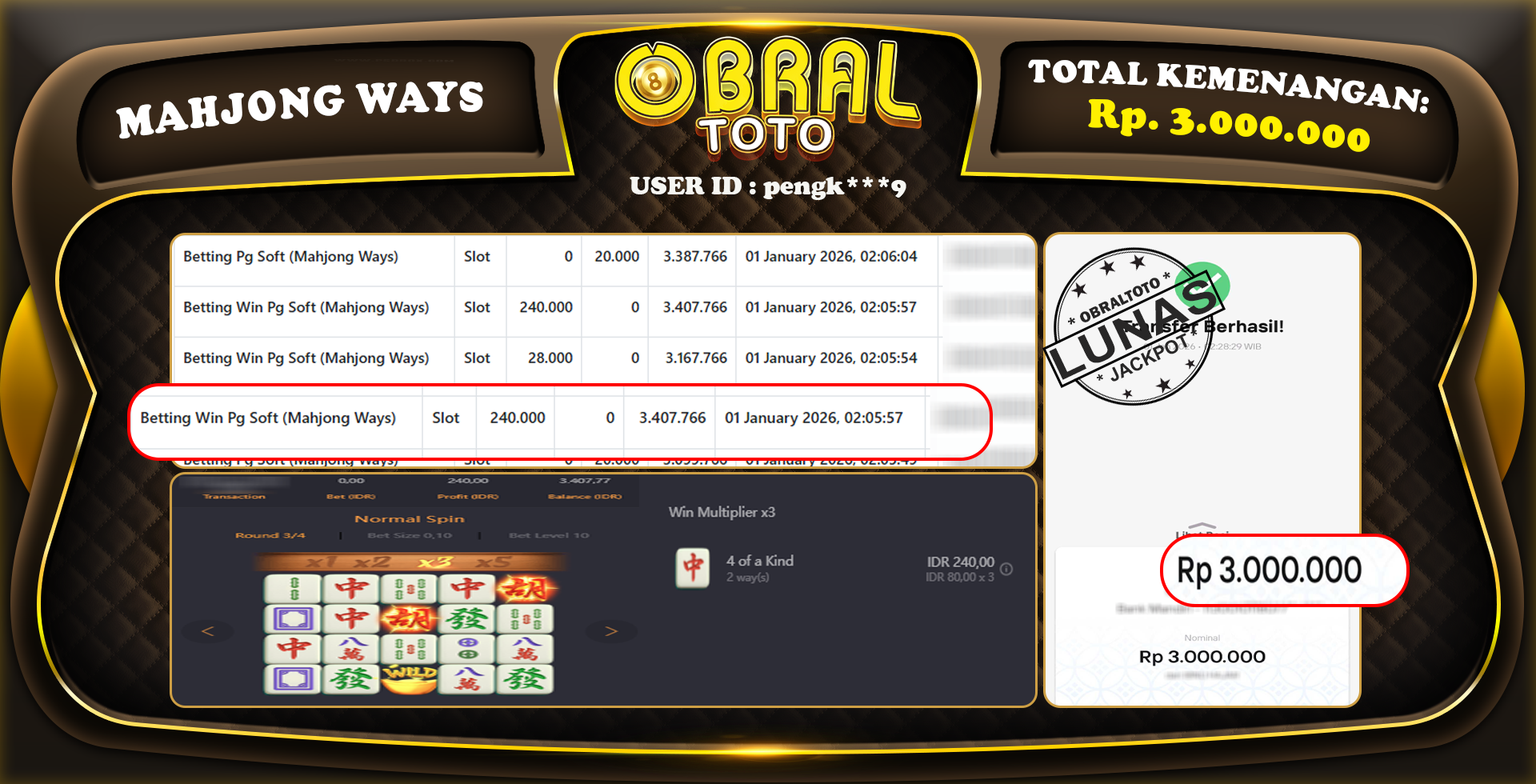 OBRALTOTO – Selamat Kepada Pemenang User id : pengk***9 JP MAHJONG WAYS Rp,3.000.000 01 January 2026- Situs game online terpercaya dengan bukti jp yang telah resmi dan terjamin di Indonesia, memberikan pengalaman bermain yang aman dan menyenangkan bagi para penggemar game online. Dengan hadirnya OBRALTOTO , pemain dapat menikmati kemudahan akses ke berbagai permainan seru, peluang memenangkan hadiah besar, serta keuntungan menarik yang telah disiapkan khusus untuk para member lama maupun member baru. Platform ini dirancang untuk memberikan kenyamanan dan keamanan, sehingga setiap pemain dapat fokus menikmati permainan sekaligus meraih keuntungan maksimal.