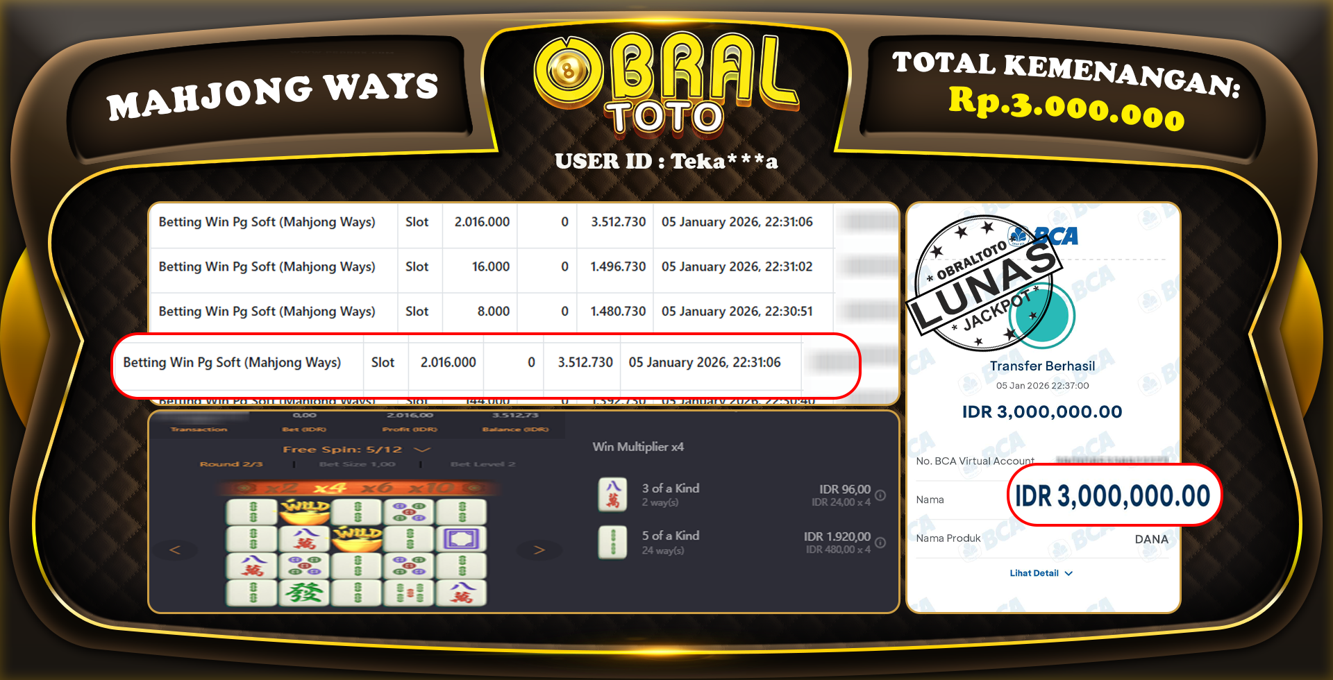 OBRALTOTO   – Selamat Kepada Pemenang User id : Teka***a JP MAHJONG WAYS  Rp,3.000.000 06 January 2026- Situs game online terpercaya dengan bukti jp yang telah resmi dan terjamin di Indonesia, memberikan pengalaman bermain yang aman dan menyenangkan bagi para penggemar game online. Dengan hadirnya OBRALTOTO , pemain dapat menikmati kemudahan akses ke berbagai permainan seru, peluang memenangkan hadiah besar, serta keuntungan menarik yang telah disiapkan khusus untuk para member lama maupun member baru. Platform ini dirancang untuk memberikan kenyamanan dan keamanan, sehingga setiap pemain dapat fokus menikmati permainan sekaligus meraih keuntungan maksimal.