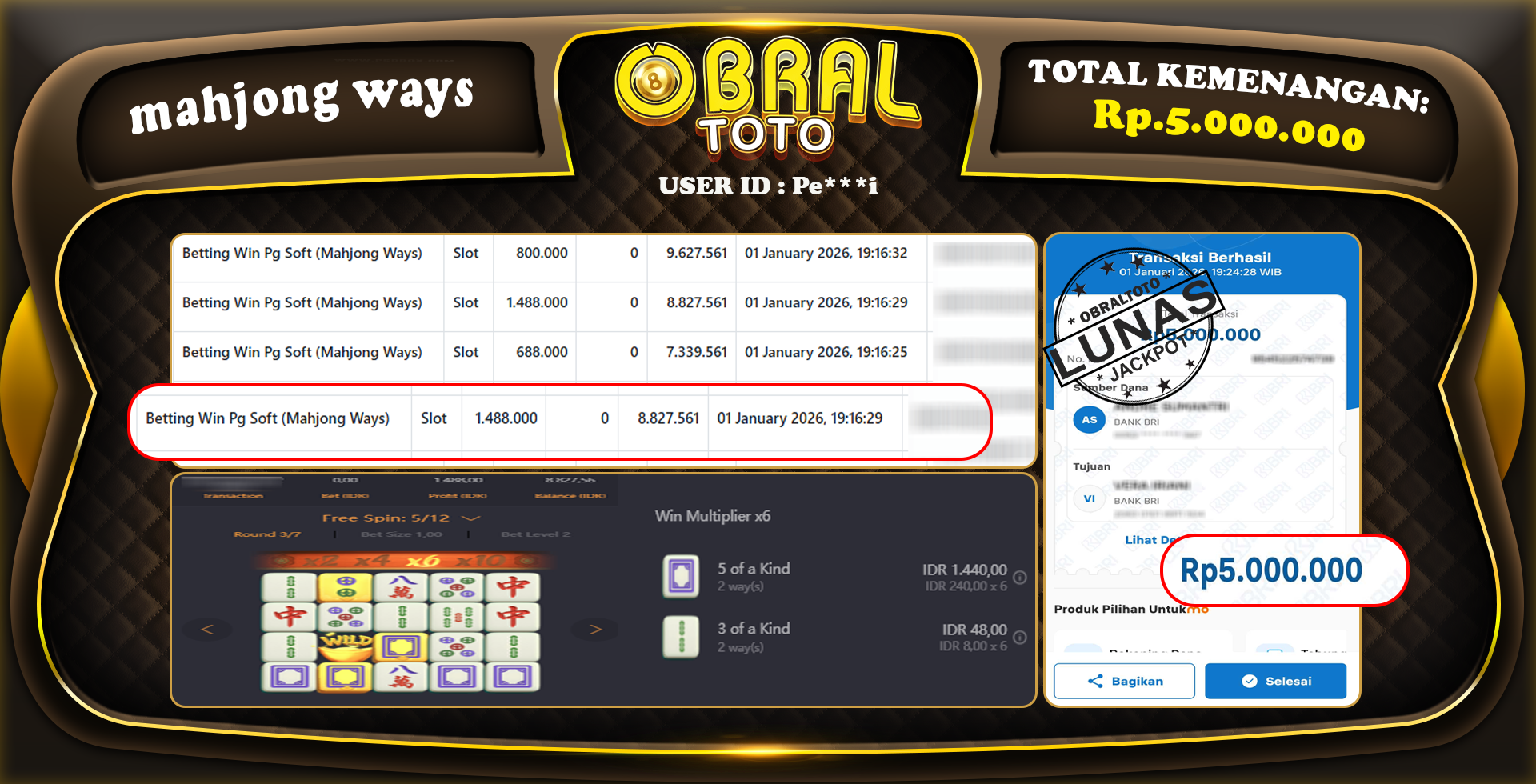 OBRALTOTO – Selamat Kepada Pemenang User id : Pe***i JP MAHJONG WAYS Rp,5.000.000 02 January 2026- Situs game online terpercaya dengan bukti jp yang telah resmi dan terjamin di Indonesia, memberikan pengalaman bermain yang aman dan menyenangkan bagi para penggemar game online. Dengan hadirnya OBRALTOTO , pemain dapat menikmati kemudahan akses ke berbagai permainan seru, peluang memenangkan hadiah besar, serta keuntungan menarik yang telah disiapkan khusus untuk para member lama maupun member baru. Platform ini dirancang untuk memberikan kenyamanan dan keamanan, sehingga setiap pemain dapat fokus menikmati permainan sekaligus meraih keuntungan maksimal.