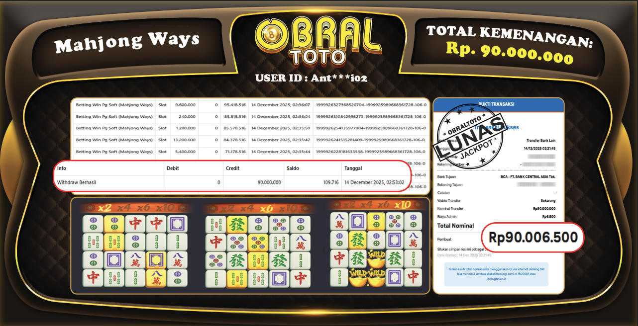 OBRALTOTO   – Selamat Kepada Pemenang User id : Ant***i02 JP MAHJONG WAYS  Rp,90.000.000 14 Desember 2025- Situs game online terpercaya dengan bukti jp yang telah resmi dan terjamin di Indonesia, memberikan pengalaman bermain yang aman dan menyenangkan bagi para penggemar game online. Dengan hadirnya OBRALTOTO , pemain dapat menikmati kemudahan akses ke berbagai permainan seru, peluang memenangkan hadiah besar, serta keuntungan menarik yang telah disiapkan khusus untuk para member lama maupun member baru. Platform ini dirancang untuk memberikan kenyamanan dan keamanan, sehingga setiap pemain dapat fokus menikmati permainan sekaligus meraih keuntungan maksimal.