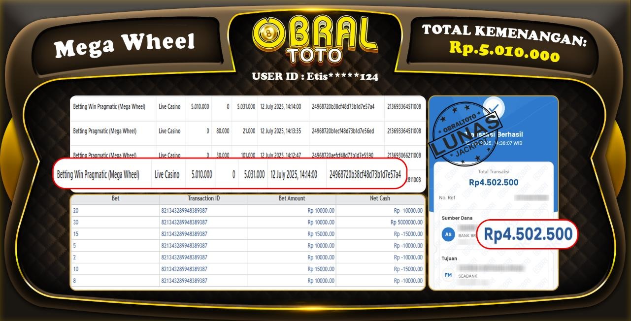 Kami merayakan selamat kepada salah satu pemain setia situs OBRAL4D yang berhasil meraih kemenangan besar senilai Rp 5.010.000 dalam permainan LIVE CASINO MEGA WHEEL  pada tanggal 12 Juli 2025. Kemenangan ini telah kami proses dan pemahaman secara LUNAS ke rekening yang terdaftar. Semoga kemenangan ini menjadi motivasi bagi pemain lainnya untuk terus mencoba keberuntungan dan menikmati permainan di OBRALTOTO.