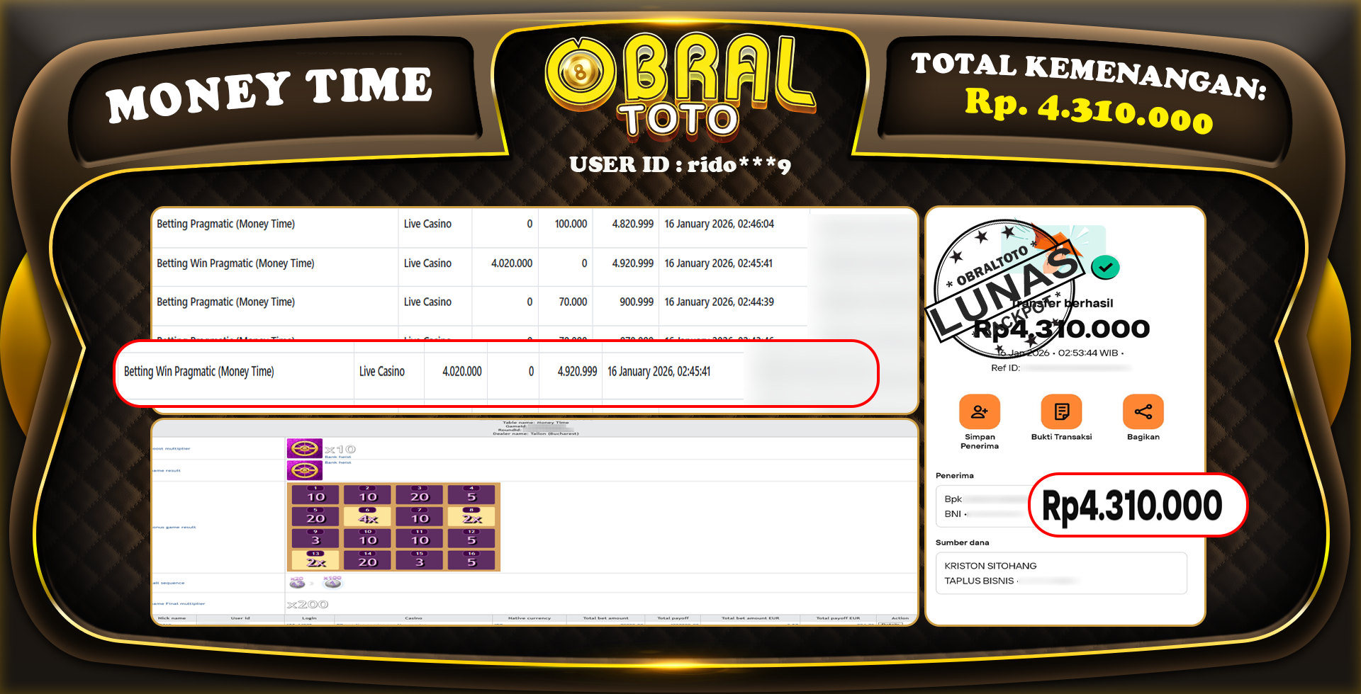Kami merayakan selamat kepada salah satu pemain setia situs OBRALTOTO yang berhasil meraih kemenangan besar senilai Rp,4.310.000 dalam permainan MONEY TIME pada tanggal 16 January 2026. Kemenangan ini telah kami proses dan pemahaman secara LUNAS ke rekening yang terdaftar. Semoga kemenangan ini menjadi motivasi bagi pemain lainnya untuk terus mencoba keberuntungan dan menikmati permainan di OBRALTOTO .