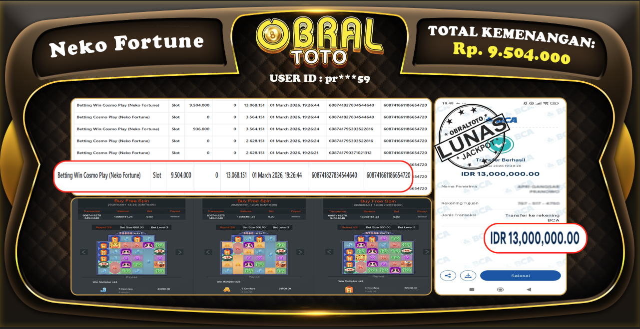 JACKPOT  NEKO FORTUNE Rp.9.504.000 Juta 02 MARET 2026
