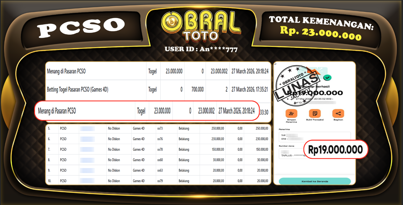 Kami merayakan selamat kepada salah satu pemain setia situs OBRALTOTO yang berhasil meraih kemenangan besar senilai Rp 23.000.000 dalam permainan PCSO pada tanggal 28 Maret 2026. Kemenangan ini telah kami proses dan pemahaman secara LUNAS ke rekening yang terdaftar. Semoga kemenangan ini menjadi motivasi bagi pemain lainnya untuk terus mencoba keberuntungan dan menikmati permainan di OBRALTOTO .